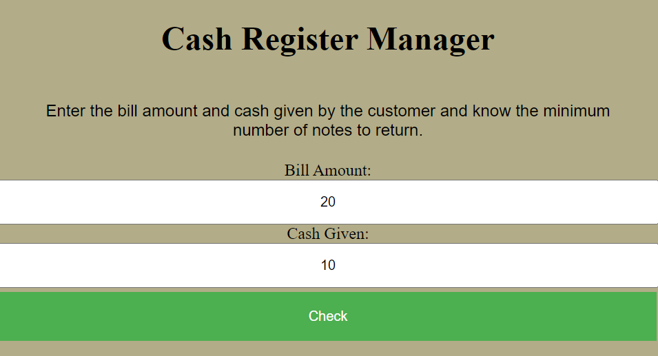 Cash Register app using HTML, CSS, and Vanilla JS. Learned problem solving skills and logic building.